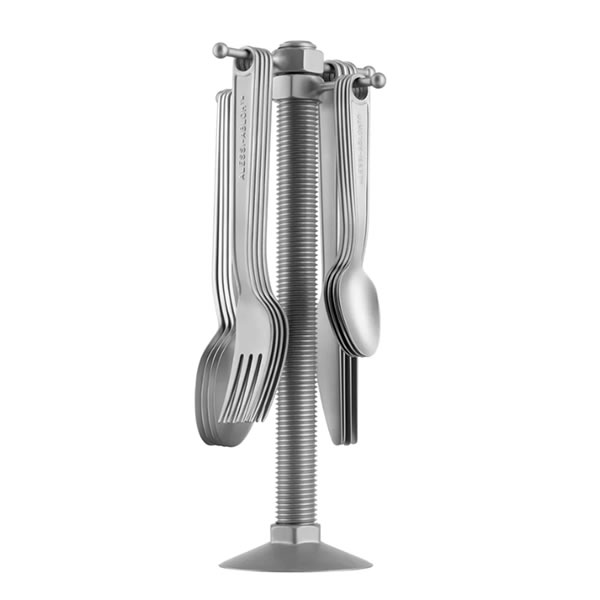 Service à couverts composé de quatre cuillers, quatre fourchettes, quatre couteaux, quatre petits cuillers en acier inoxydable 18/10. Porte-couverts en acier inoxydable 18/8.