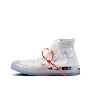 Released in 2017, “The Ten,” created in collaboration with designer Virgil Abloh, was one of the fastest and most ambitious collaborations Nike has ever produced, taking about ten months from ideation to release. The set is divided into two different design categories, named “REVEALING” and “GHOSTING.” “REVEALING” consists of pairs that are meant to feel “accessible”, using design techniques to look hand-cut, open-sourced, and rebuilt. “GHOSTING” features translucent uppers, with the goal to further the concept of revealing, while also uniting the second set of silhouettes through common material. Featured in the “GHOSTING” series, the Chuck 70 Vulcanized is Abloh’s reimagination of one of the most timeless sneakers ever created. This sample, slightly different from the wider release of the sneaker, features a textile upper as opposed to the translucent rubber upper, a vulcanized outsole and Off-White branding on the medial side. This pair is also sample stamped on the interior of the tongue. Off-White Converse Chuck 70 “The Ten” Vulcanized Sample. Translucent rubber upper with a vulcanized outsole. Off-White branding on the medial side. “Sample” stamped on the interior of the tongue. Style number: 161034C This item is final sale and not eligible for return.