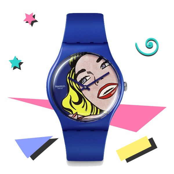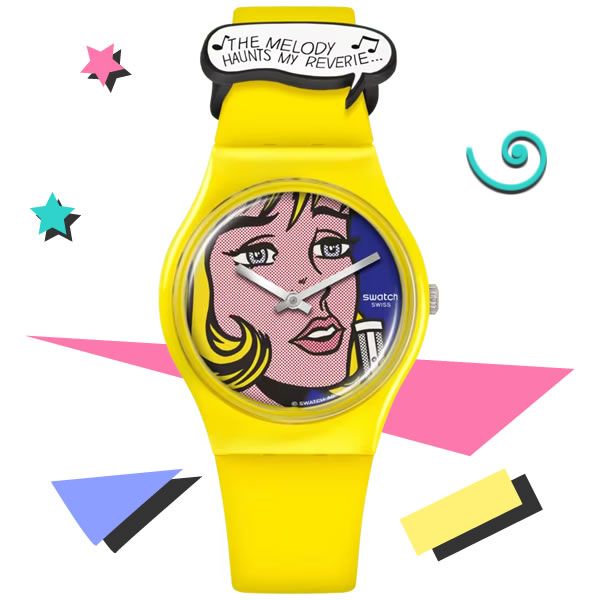 Le modèle REVERIE BY ROY LICHTENSTEIN, THE WATCH reproduit l’œuvre Reverie de l’artiste Roy Lichtenstein sur le cadran de la montre – une collaboration qui met le pop art à l’honneur. Son bracelet jaune mat avec des passants imprimés et son boîtier assorti font ressortir le cadran multicolore tout en soulignant la collaboration Swatch x MoMA. ©2023 The Museum of Modern Art. The Museum of Modern Art, MoMA, and related logos are Trademarks of The Museum of Modern Art. © 2023 Estate of Roy Lichtenstein. Roy Lichtenstein™
